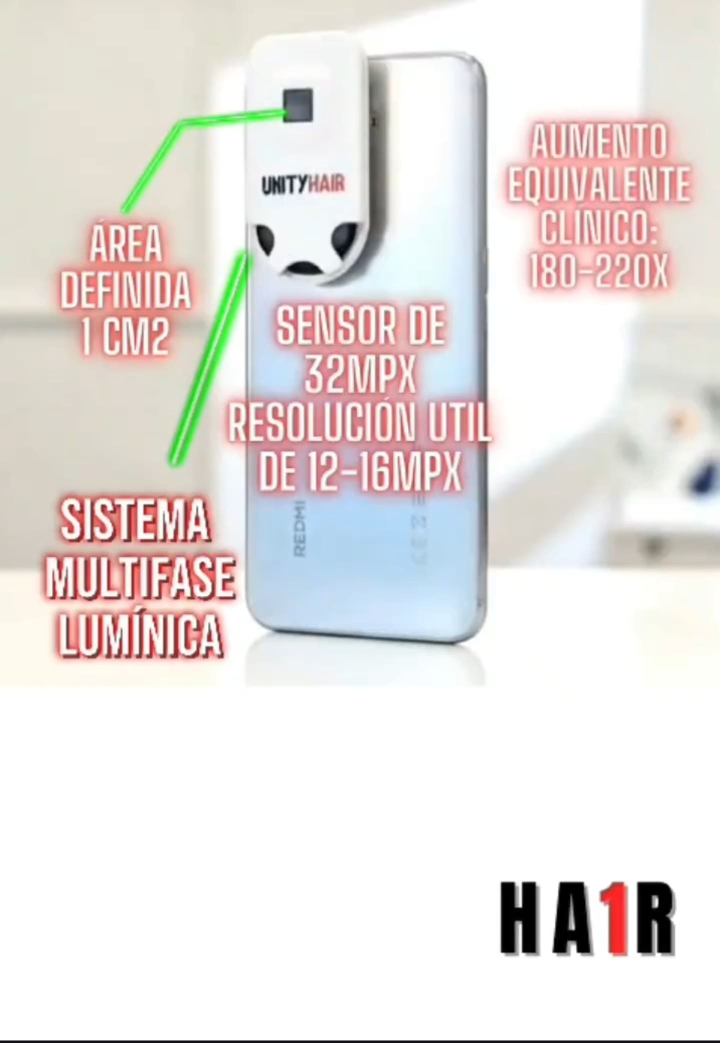 CODE:REDBOX es un nuevo servicio de UNITYHAIR que consta de 3 componentes: un tricoscopio el HA1R adaptado al móvil diseñado por nuestro equipo médico para uso en el ámbito médico y no médico, un software, llamado HAIRSPECTRA que es una herramienta de ayuda diagnóstica enfocada en el diagnóstico de alopecia androgénica y a su vez sirve de entrenamiento al profesional capilar, y la UHFormación un minicurso introductorio en formato vídeos basados en la temática de la tricoscópia.